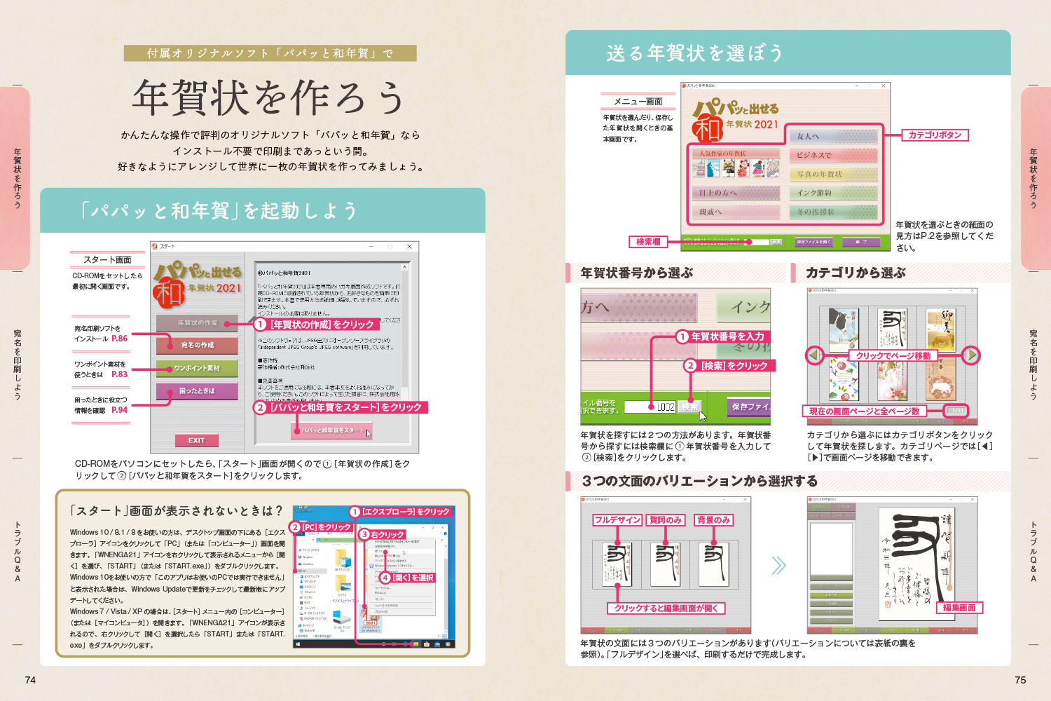 臼井:年賀状の本は、読む人が本にもパソコンにも慣れていない分、迷わないように、わかりやすく伝えることに特にこだわりました。文章の書き方だけでなく、ページ内での目の動きを考えてこちらに書いた方がいいとか、そういうところまで考えてやりました。