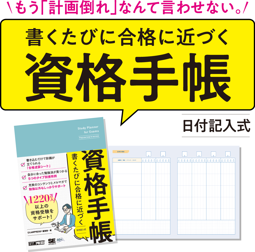 資格手帳は、仕事・家事・育児など、日々時間に追われながらも、資格取得に向けて頑張りたいあなたのための手帳です。翔泳社40周年を記念して、1998年から約28年間、1,220万部以上の資格書を手掛けてきたEXAMPRESS®編集部のノウハウを詰め込んで作られました。