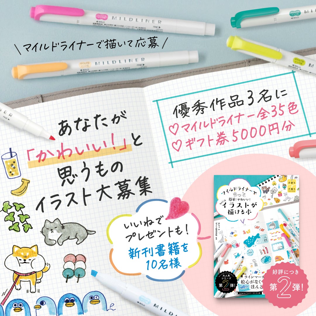 「ちょっとしたイラストを描いてみたいけど難しい」「手帳やノートにちょっとしたイラストをかんたんにかわいく描きたい」そんな方におすすめの『マイルドライナーでもっと簡単!かわいい! ちょこっとイラストが描ける本』が発売になりました。本書は、どんな人でも本当にかわいく描けると好評をいただいた書籍『マイルドライナーで簡単!かわいい!ちょこっとイラストが描ける本』に続く、第二弾の企画です。