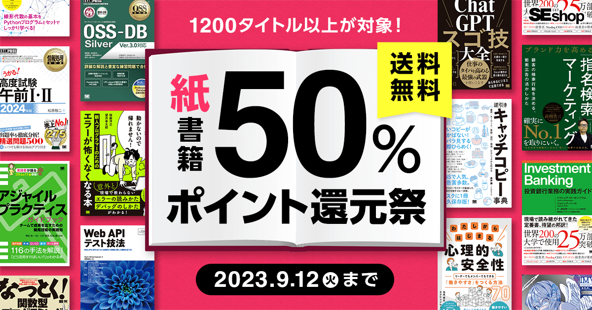 SEshopは、IT書・ビジネス書をはじめ、資格書や実⽤書まで幅広いラインナップを展開する翔泳社の公式通販サイトです。9月12日 まで、紙の書籍を購入すると、本体価格の50%をポイント還元するキャンペーンを開催します。1冊からでも送料無料でお届けします。