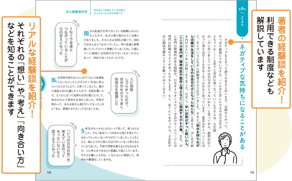 本書は、恋愛・結婚やメンタル、仕事、お金、容姿など……なかなか病院の先生や看護師さんには聞きづらい10の話題について、がん経験者のインタビューをもとにまとめています。特に情報が少ないとされるAYA世代(15歳~39歳)の方たち情報も多く取り上げています。