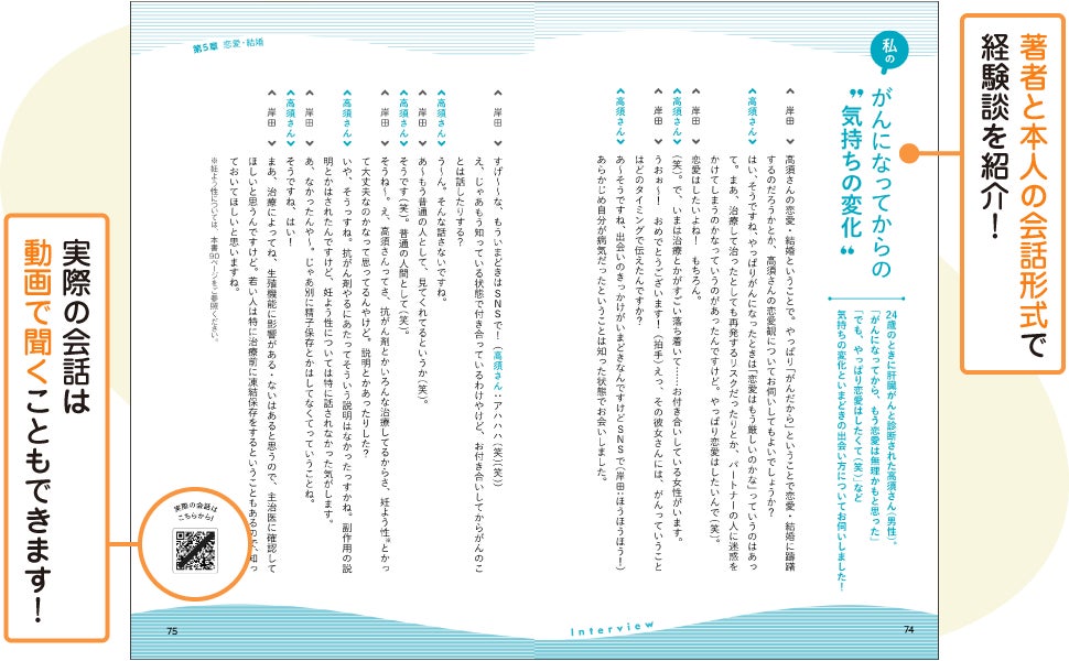 25歳のときに胎児性がんという希少がんになった著者は、一歩踏み込んだ患者側の生活の情報があまりないと感じました。医療情報も大切だけれど、患者側の生活情報も同じくらい大切だと考え、がん経験者の方などにインタビューしてその情報を発信するYouTube番組『がんノート』を開始。本書では、「がんになってからの恋愛・結婚って?」「周りと比較して辛くなったときどうした?」「治療と仕事をどのように両立してきた?」といった『がんノート』の活動を通して聞いてきた、がん経験者のリアルな体験談を掲載しています。