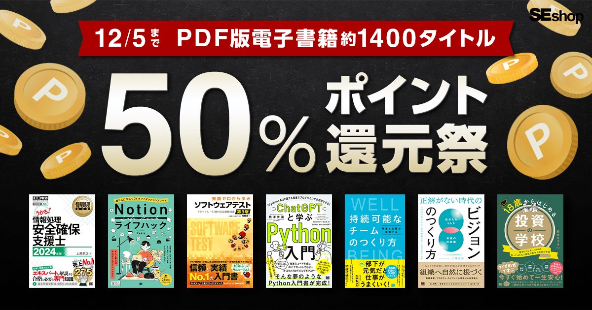 SEshopは、IT書・ビジネス書をはじめ、資格書や実⽤書まで幅広いラインナップを展開する翔泳社の公式通販サイトです。12月5日 まで、デバイスの種類を問わず利用できるPDF形式の電子書籍を購入すると、本体価格の50%をポイント還元するキャンペーンを開催します。貯まったポイントは1ポイント=1円として次回のお買い物から使えます。新刊含む約1400タイトルが対象です。
