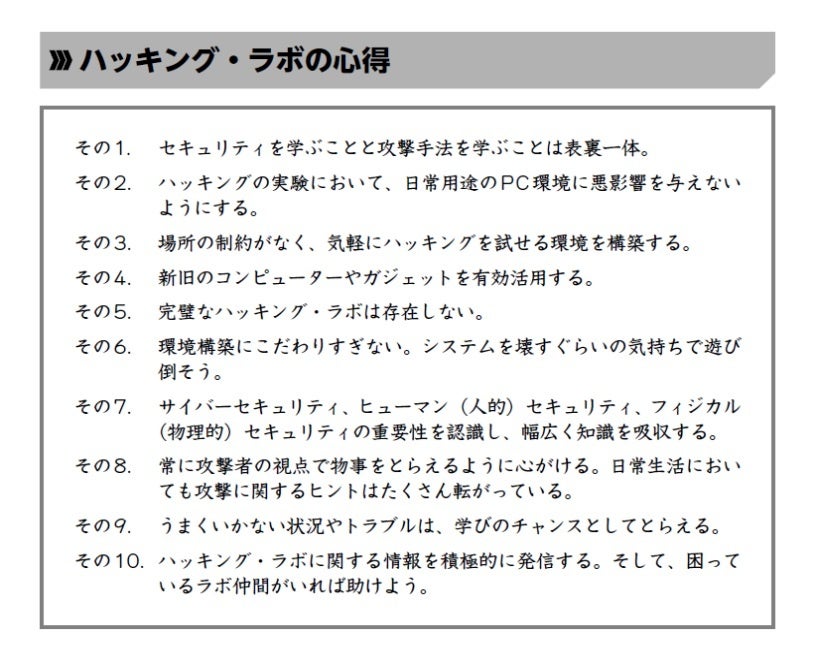 本書では、セキュリティスキル向上を目的として、自分のPC上に仮想環境「ハッキング・ラボ」を構築し、ハッキングの実験を行います。ハッキング・ラボを構築するために、高価な装置や広い部屋といった特別なものは必要ありません。一般的なスペックのPC とインターネット環境だけで十分です。構築を通じて、OSやネットワークの知識を吸収します。ネットワークに接続するというだけでなく、逆に制限するという観点を考えられるようになります。