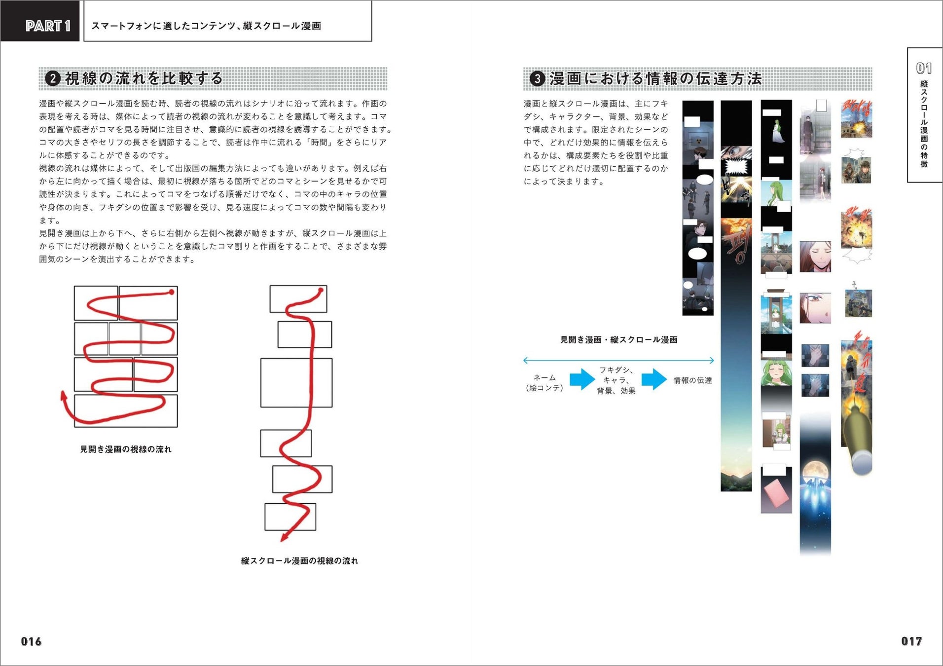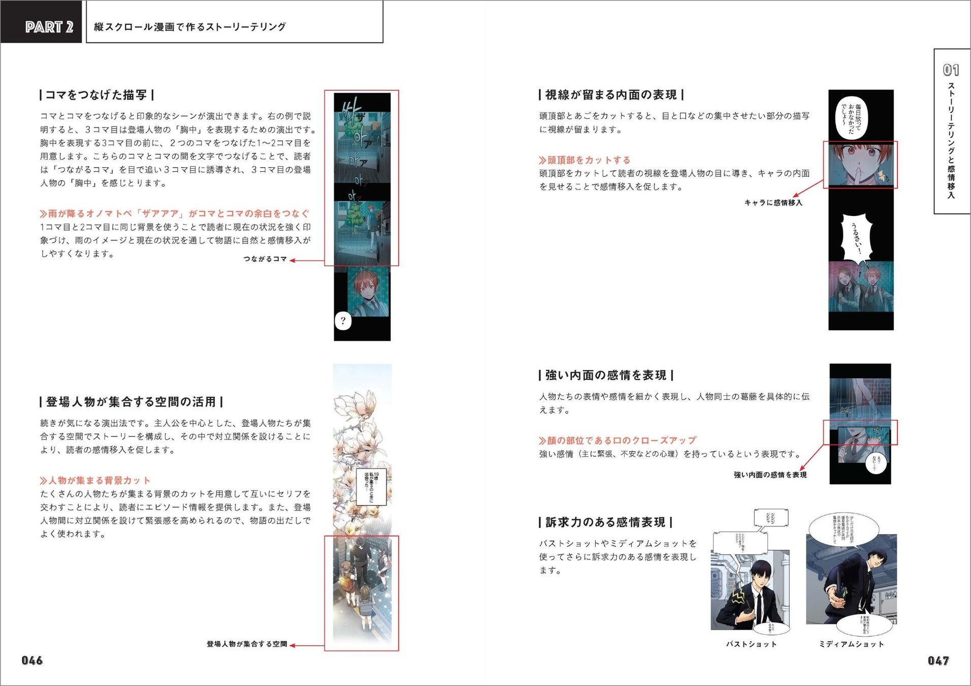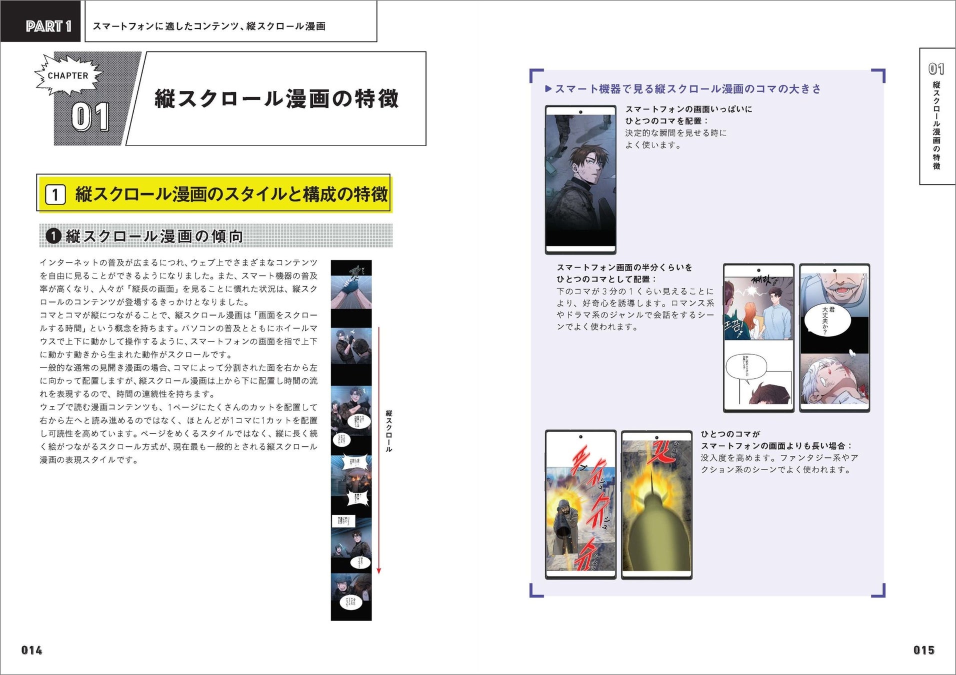 本書では、韓国でウェブトゥーン作家養成スクールを運営する人気ベテラン作家が、縦スクロール漫画制作を網羅的に解説します。従来の見開き漫画とは異なり、スマートデバイスに最適化された縦スクロール漫画ならではのストーリーの組み立て方や発想法、コマ割りの演出技法、シーンの演出について実例を紹介しながら説明します。
