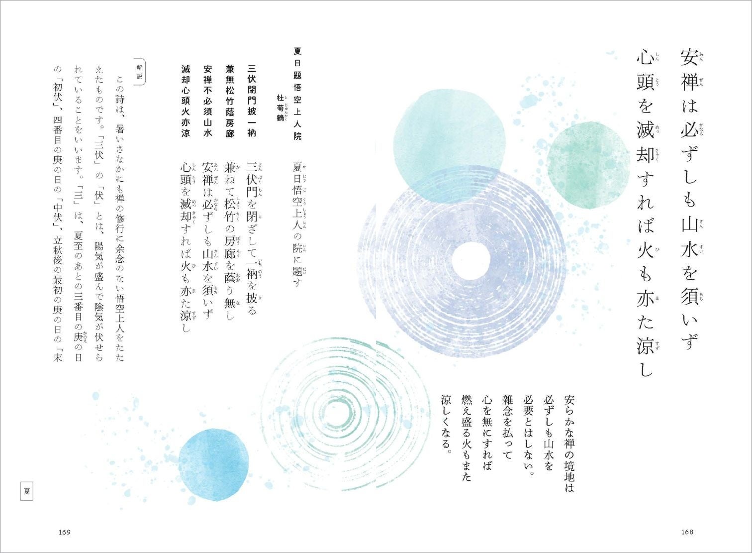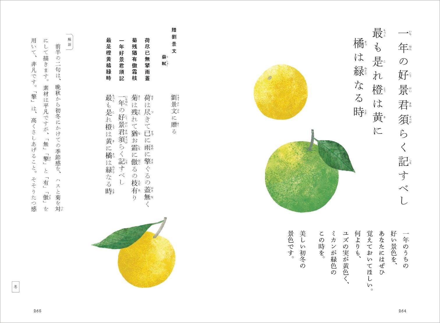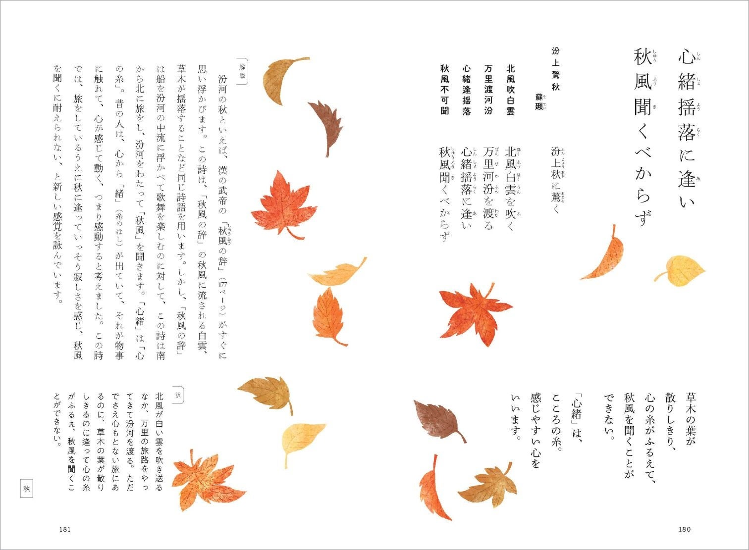 本書は、季節をテーマに私たちの暮らしに寄り添い、古来変わらない季節の情感や風物を詠んだ、100の言葉から始める漢詩入門です。イオクサツキさんの美しくやわらかなイラストとともに、現代に生きる私たちも共感できる情感が込められた、美しい漢詩の一節を紹介します。唐代を代表する白楽天や李白、杜甫をはじめ、孟浩然、王維、范成大(はんせいだい)などの漢詩だけでなく、菅原道真や夏目漱石などによる日本の漢詩も取り上げます。