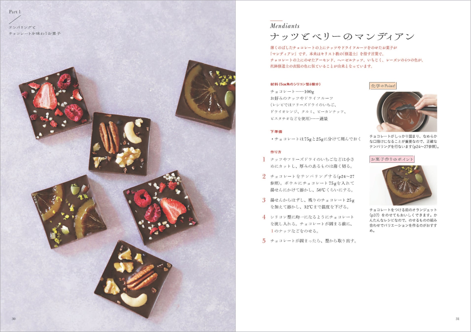 PART1は、テンパリングの基本と、テンパリングしたチョコレートを使ったレシピを紹介。薄くのばしたチョコレートの上にナッツやドライフルーツをのせたお菓子が「マンディアン」です。各レシピには、化学的観点からのポイントをまとめた「化学のPoint!」、お菓子作りの面から注意したい点などをまとめた「お菓子作りのポイント」を記載しています