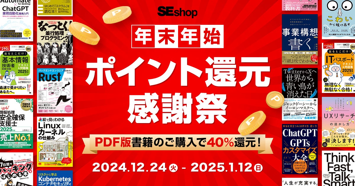 株式会社翔泳社(本社:東京都新宿区⾈町5、社⻑:佐々⽊幹夫)の運営する公式通販サイトSEshopは、 2024年12月24日(火)から2025年1月12日(日) までPDF版電子書籍の一部新刊を含む1600タイトル以上が40%ポイント還元となる「SEshop 年末年始ポイント還元感謝祭」を開催します。