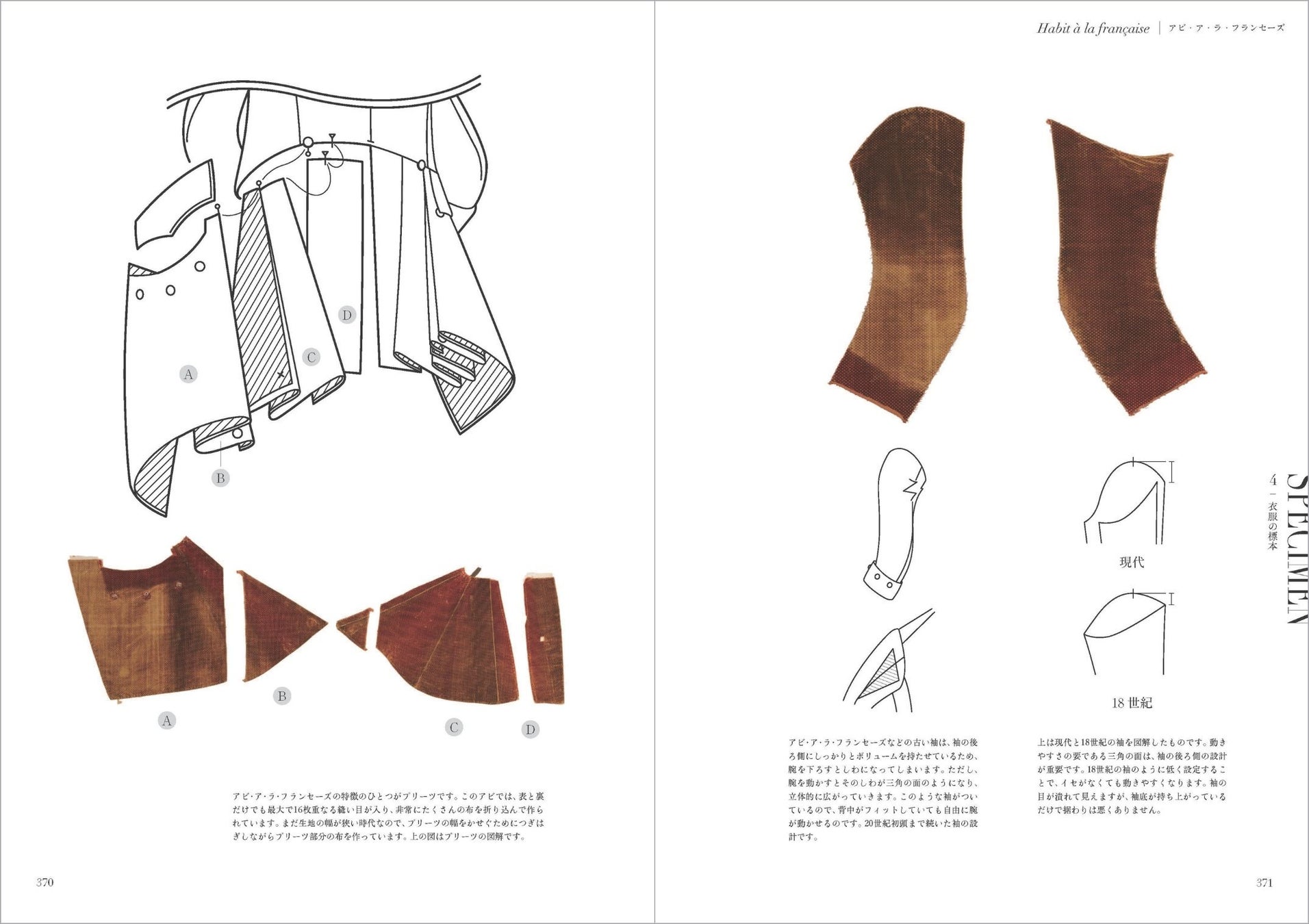 生地のアップや裏側、ステッチ、ボタンや刺繍など、博物館でも見られないディテールと、分解した衣服のパーツを並べた衣服の標本で、衣服の内部構造を覗きみることができます。図解付きで丁寧にそれぞれの構造や造形のポイントを解説します。