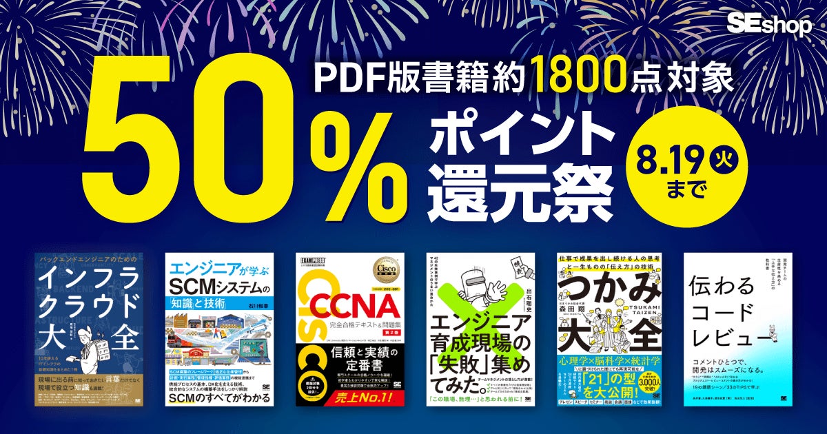 SEshopは、IT書・ビジネス書をはじめ、資格書や実⽤書まで幅広いラインナップを展開する翔泳社の公式通販サイトです。8月19日(火) まで、PDF版の対象書籍を購入すると、本体価格の50%をポイント還元するキャンペーンを開催します。貯まったポイントは1ポイント=1円として次回のお買い物から使えます。新刊含む約1,800点のタイトルが対象となります。