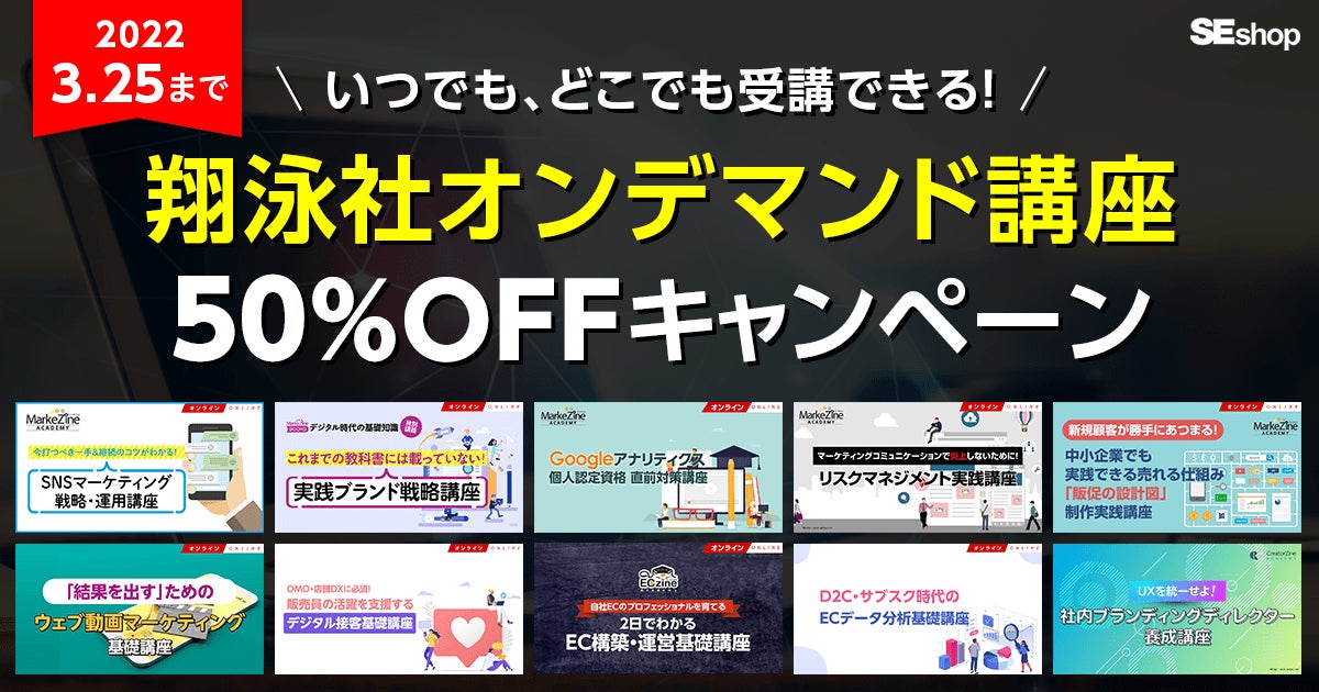 株式会社翔泳社(本社:東京都新宿区舟町5、社長:佐々木幹夫)は、「翔泳社オンデマンド講座50%OFFキャンペーン」を本日12月24日より開始します。2022年3月25日まで、マーケティングやECなど実務に使えるオンデマンド講座を通常価格の50%OFFで提供します。※一部除外商品あり