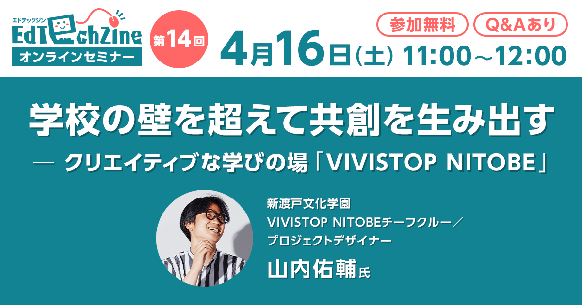 株式会社翔泳社(本社:東京都新宿区舟町5、代表取締役社長:佐々木幹夫)が運営する教育ICTのWebメディアEdTechZine(エドテックジン)は、第14回オンラインセミナー「学校の壁を超えて共創を生み出す──クリエイティブな学びの場『VIVISTOP NITOBE』の取り組み」を2022年4月16日(土)に開催します。参加費は無料です(事前登録制)。