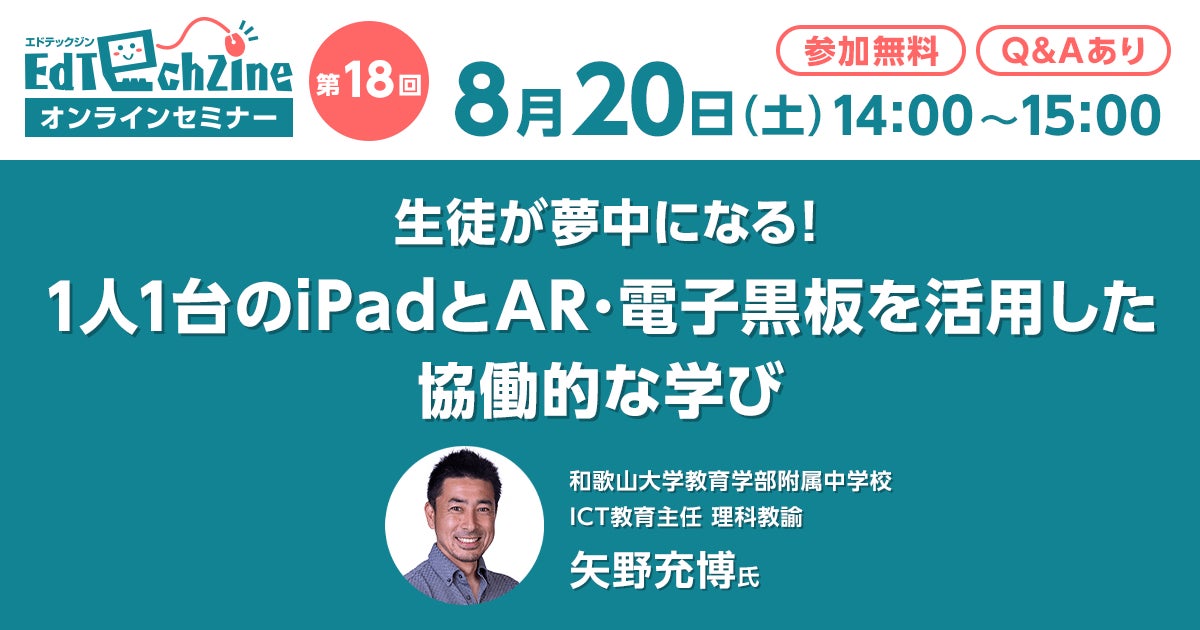 本セミナーでは、和歌山大学教育学部附属中学校 ICT教育主任 理科教諭の矢野充博先生にご登壇いただき、1人1台のiPadとAR・電子黒板を組み合わせて実現する「生徒が夢中になる」授業を紹介いただきます。理科以外の教科を担当する先生にも参考にしていただける内容です。