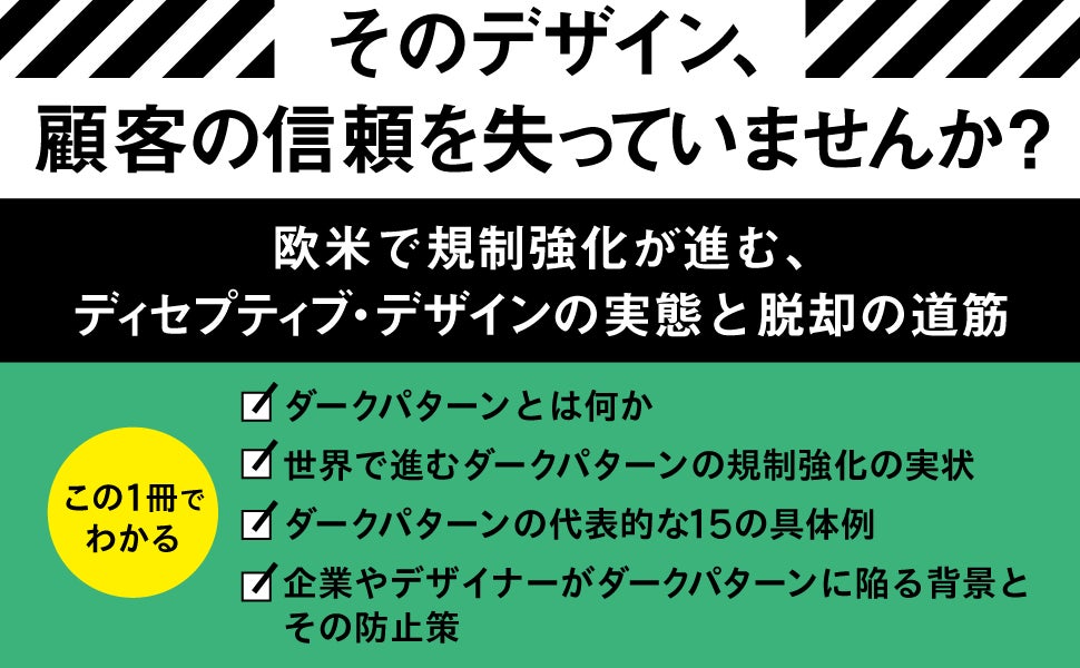 本書は、ダークパターンとは何かから、世界で進むダークパターンの規制強化の実状、ダークパターンの代表的な15の具体例、企業やデザイナーがダークパターンに陥る背景とその防止策までをまとめた1冊です。誰もが使ってしまう可能性がある一方で、ブランドを棄損するリスクも秘めたダークパターンについて理解を深めましょう。