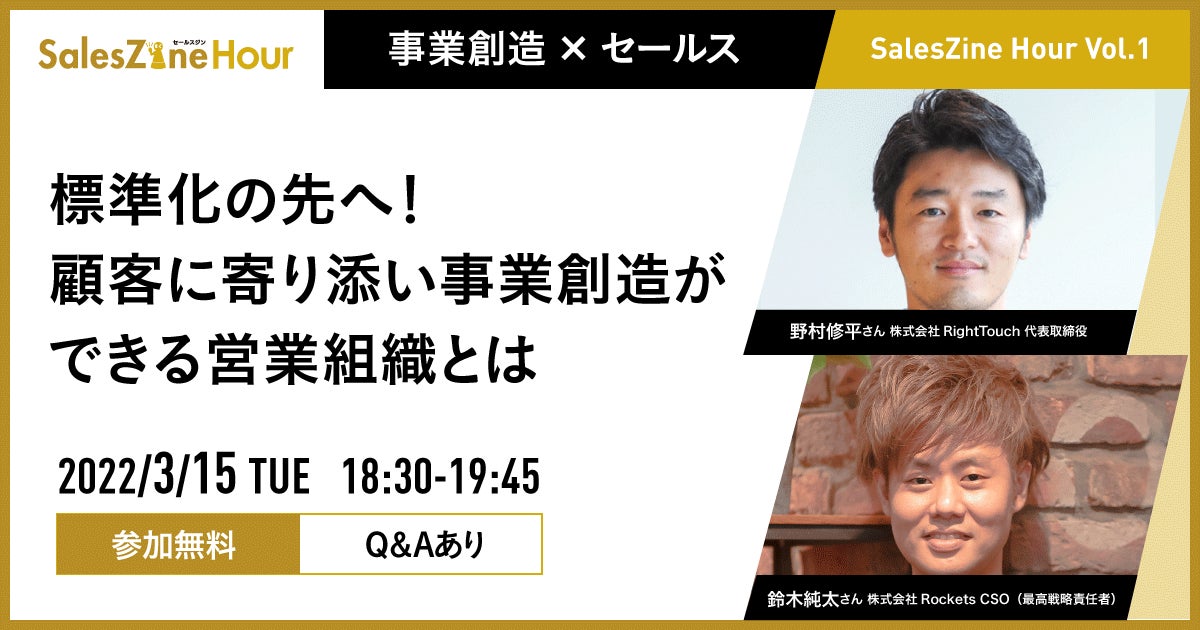 今回登壇いただくのは、既存顧客の課題に寄り添うことで、高い成果や新規事業創出を実現してきた株式会社RightTouch 代表取締役 野村修平氏と、数々のスタートアップの営業組織を支援し、事業開発セールスをテーマに発信を続ける株式会社Rockets CSO(最高戦略責任者)鈴木 純太(ジェイ)氏です。